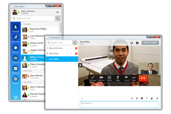 Приложение Cisco Jabber для унифицированных коммуникаций поддерживает функции учета присутствия, мгновенных сообщений, передачи голоса, видео и голосовых сообщений, совместной работы и конференц-связи на обычных компьютерах, компьютерах с операционной системой Mac OS, планшетных системах и смартфонах. Cisco Jabber помогает корпоративным пользователям осуществлять несложный и безопасный, с точки зрения доступа к информации, поиск нужных людей, выяснять, доступны ли они для связи, а также вести совместную работу.
